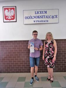 Uczeń Liceum Ogólnokształcącego w Psarach Łukasz Rzeźniczek uzyskał wynik dobry w Ogólnopolskim Konkursie Języka Angielskiego FOX pod patronatem Instytutu Filologii Angielskiej Uniwersytetu Jagiellońskiego w Krakowie. W konkursie tym przyznawane jest tylko miejsce pierwsze, a osiągnięty przez naszego ucznia wynik dobry odpowiada miejscu trzeciemu. W tegorocznej edycji konkursu FOX wzięło udział łącznie 14 uczniów klasy pierwszej, drugiej i trzeciej Liceum Ogólnokształcącego w Psarach. W kategorii Lions (I klasa LO) nasi uczniowie zajęli drugie miejsce w powiecie wśród szkół ponadgimnazjalnych. Podobnie jak w kategorii Eagles (II i III klasa LO), gdzie nasza szkoła zajęła również drugie miejsce w powiecie spośród wszystkich szkół ponadgimnazjalnych startujących w tej edycji konkursu.