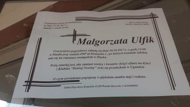 Z głębokim żalem zawiadamiamy, że dnia 15.10.2017 r. zmarła Małgorzata Ulfik - wieloletni nauczyciel Liceum Ogólnokształcącego w Psarach. Uroczystości pogrzebowe odbędą się dnia 20.10.2017 r. o godzinie 14:00 w Piasku przy remizie OSP ul Strażacka 2, po których kondukt żałobny uda się na cmentarz ewangelicki w Piasku.