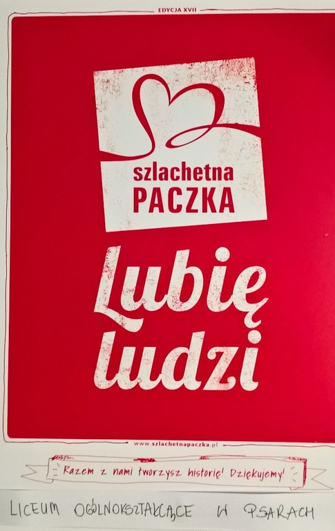 Serdecznie dziękuję wszystkim, którzy włączyli się w akcję Szlachetnej Paczki organizowaną w LO w Psarach. Dziękuję: uczniom, ich rodzicom, opiekunom, nauczycielom, pracownikom szkoły oraz wszystkim tym, którzy wsparli w jakikolwiek sposób przedsięwzięcie organizowane w naszej szkole. W tym roku zebraliśmy łącznie 22 paczki, które trafią do dwóch potrzebujących rodzin. Akcja ta jest organizowana w naszym Liceum po raz kolejny, tym razem patronuje jej hasło „Lubię ludzi”. Cieszę się, że ta forma wolontariatu cieszy się ogromnym zainteresowaniem i zaangażowaniem społeczności szkolnej. Dziękuję :)