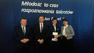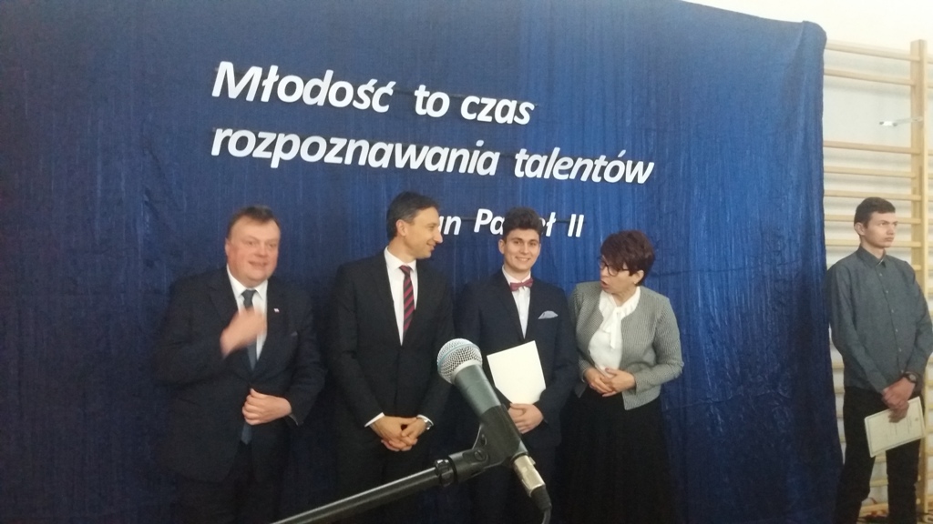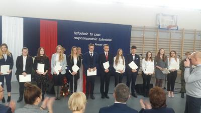 „Młodość to czas rozpoznawania talentów” — te słowa Jana Pawła II stanowiły motto uroczystości wręczenia stypendiów Prezesa Rady Ministrów najlepszym uczniom szkół średnich w regionie częstochowskim. Tym razem uroczysta gala, uświetniona obecnością śląskiego Kuratora Oświaty pani Urszuli Bauer oraz wicewojewody śląskiego Roberta Magdziarza, odbyła się w Zespole Szkół Ekonomicznych w Częstochowie 12 grudnia ubiegłego roku. To zaszczytne wyróżnienie przysługuje co roku najlepszym uczniom szkół maturalnych w całej Polsce. W roku szkolnym 2018/2019 stypendystą z Liceum Ogólnokształcącego w Psarach po raz kolejny został Paweł Mośny, uzyskując najwyższą średnią ocen spośród wszystkich uczniów naszej szkoły. Paweł jest uzdolniony w różnych dziedzinach, jest m.in. laureatem wojewódzkiego konkursu z języka niemieckiego i świetnym sportowcem. Oprócz tego wielką pasją Pawła jest gra na organach. Składając mu gratulacje, życzymy nie tylko dalszych sukcesów w nauce, w tym doskonałych wyników na egzaminie maturalnym, ale także realizacji wszelkich życiowych ambicji. Warto obejrzeć telewizyjną relację z tego wydarzenia, w której Paweł udzielił reporterowi TV Orion krótkiego wywiadu (relacja dostępna w internecie na stronie http://www.tvorion.pl/?action=show_news&idNews=26413, <pobierz> a także na stronie internetowej szkoły).