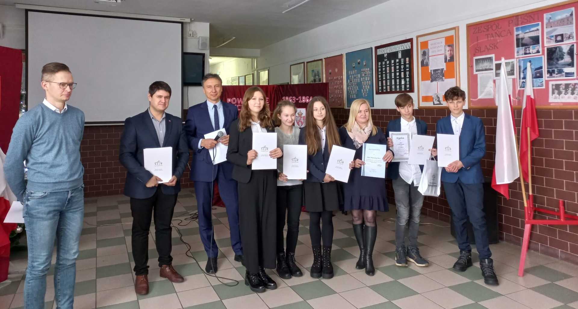 Jak co roku honorowy patronat nad konkursem objął Poseł Ziemi Lublinieckiej pan Andrzej Gawron, który ufundował nagrody, w tym najcenniejszą - wycieczkę wszystkich uczestników do Sejmu RP, która odbędzie się wiosną przyszłego roku. Słowa podziękowania kierujemy także do dyrektora biura poselskiego pana Dawida Smola, na którego wsparcie zawsze możemy liczyć. Dziękujemy! Szkolnym koordynatorem konkursu był pan Marcin Kucharski. Następny konkurs - już za rok - serdecznie zapraszamy