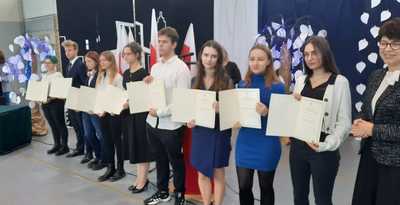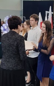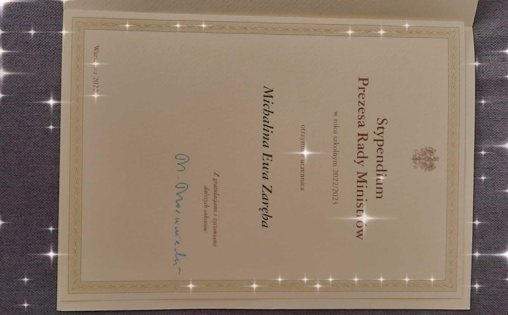 Na uroczystej gali w Częstochowie Michalina Zaręba, uczennica klasy czwartej, odebrała dziś z rąk Śląskiego Kuratora Oświaty, pani Urszuli Bauer, dyplom sygnowany przez Prezesa Rady Ministrów. W ten sposób uhonorowani zostali uczniowie szkół ponadpodstawowych, którzy w ubiegłym roku szkolnym uzyskali najwyższe wyniki w nauce i wzorową ocenę zachowania.