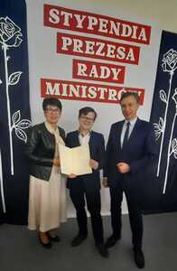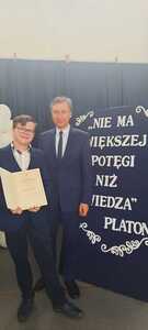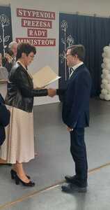 Szymon Oleksik, przyszłoroczny maturzysta, wziął dzisiaj udział w uroczystej gali stypendystów Prezesa Rady Ministrów. Pamiątkowy dyplom otrzymał z rąk Śląskiej Kurator Oświaty pani Urszuli Bauer w towarzystwie najlepszych uczniów szkół średnich naszego regionu. Na to specjalne wyróżnienie zasłużył, osiągajac w poprzednim roku szkolnym najwyższą średnią ocen w szkole i wzorowe zachowanie. Szymon jest rzeczywiście wzorem dla innych uczniów - nie tylko dzięki sukcesom edukacyjnym, ale także z uwagi na aktywność w działaniach na rzecz szkoły i pomoc innym uczniom w nauce. Jego kultura osobista i pogoda ducha inspirują całą szkolną społeczność.
