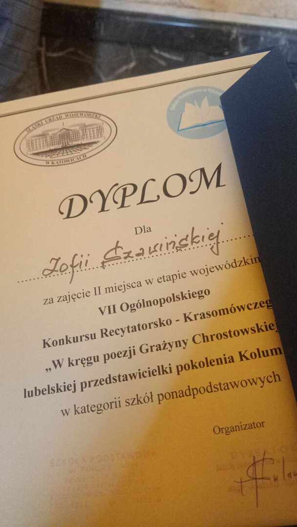 Brawo! Kolejny, ogromny sukces Zofii Szawińskiej! Tym razem uczennica wywalczyła 2. miejsce w wojewódzkim etapie Ogólnopolskiego Konkursu Recytatorsko-Krasomówczego „W kręgu poezji Grażyny Chrostowskiej" w Katowicach. W przyszłym tygodniu Zosia będzie reprezentowała województwo śląskie podczas przesłuchań ogólnopolskich w Lublinie. Życzymy powodzenia i trzymamy kciuki.