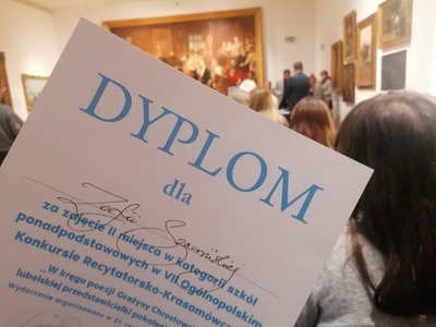 Dzisiaj, w niezwykłych wnętrzach Muzeum Narodowego w Lublinie, Zosia Szawińska reprezentowała województwo śląskie podczas gali Ogólnopolskiego Konkursu Recytatorsko - Krasomówczego "W kręgu poezji Grażyny Chrostowskiej". Uczennica wywalczyła 2. miejsce - potwierdzając, że należy obecnie do najlepszych recytatorów w kraju.