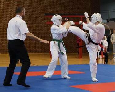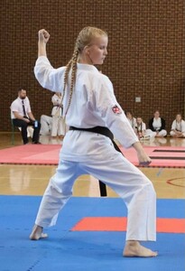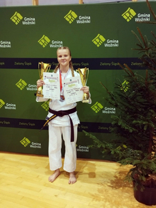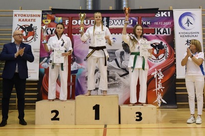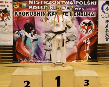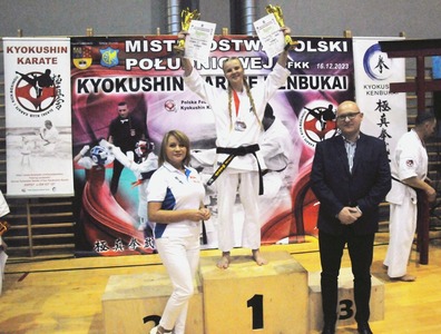 Gratulujemy wspaniałego sukcesu Katarzynie Maruszczyk! Na Mistrzostwach Polski Południowej Polskiej Federacji Kyokushin Karate, które miały miejsce 16.12.2023r. w Woźnikach, Kasia wywalczyła pierwsze miejsce w konkurencji kumite oraz zdobyła pierwsze miejsce w konkurencji kata