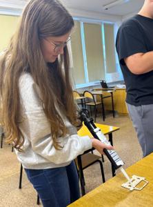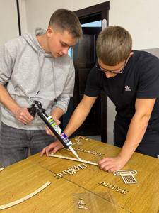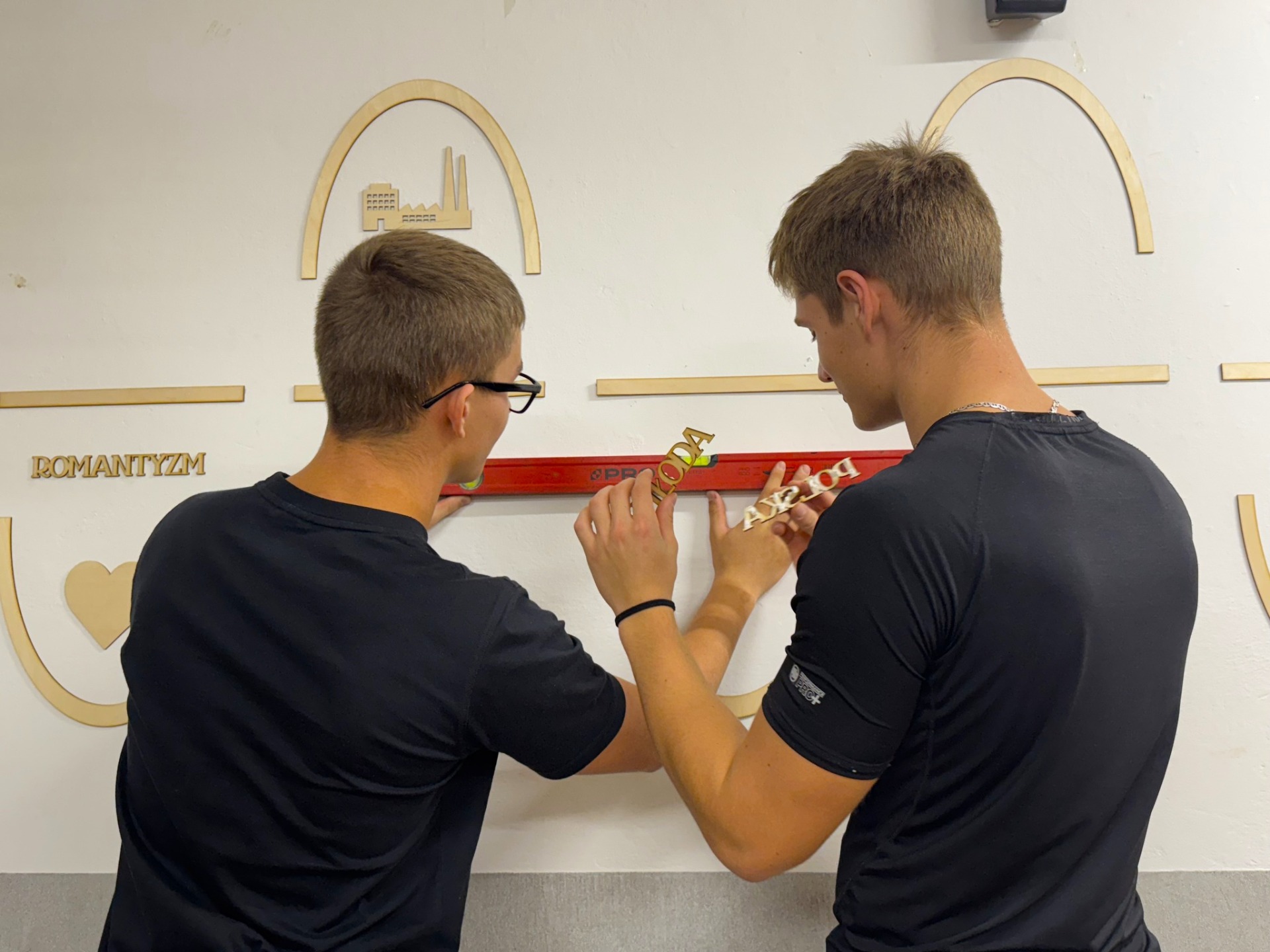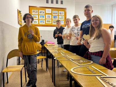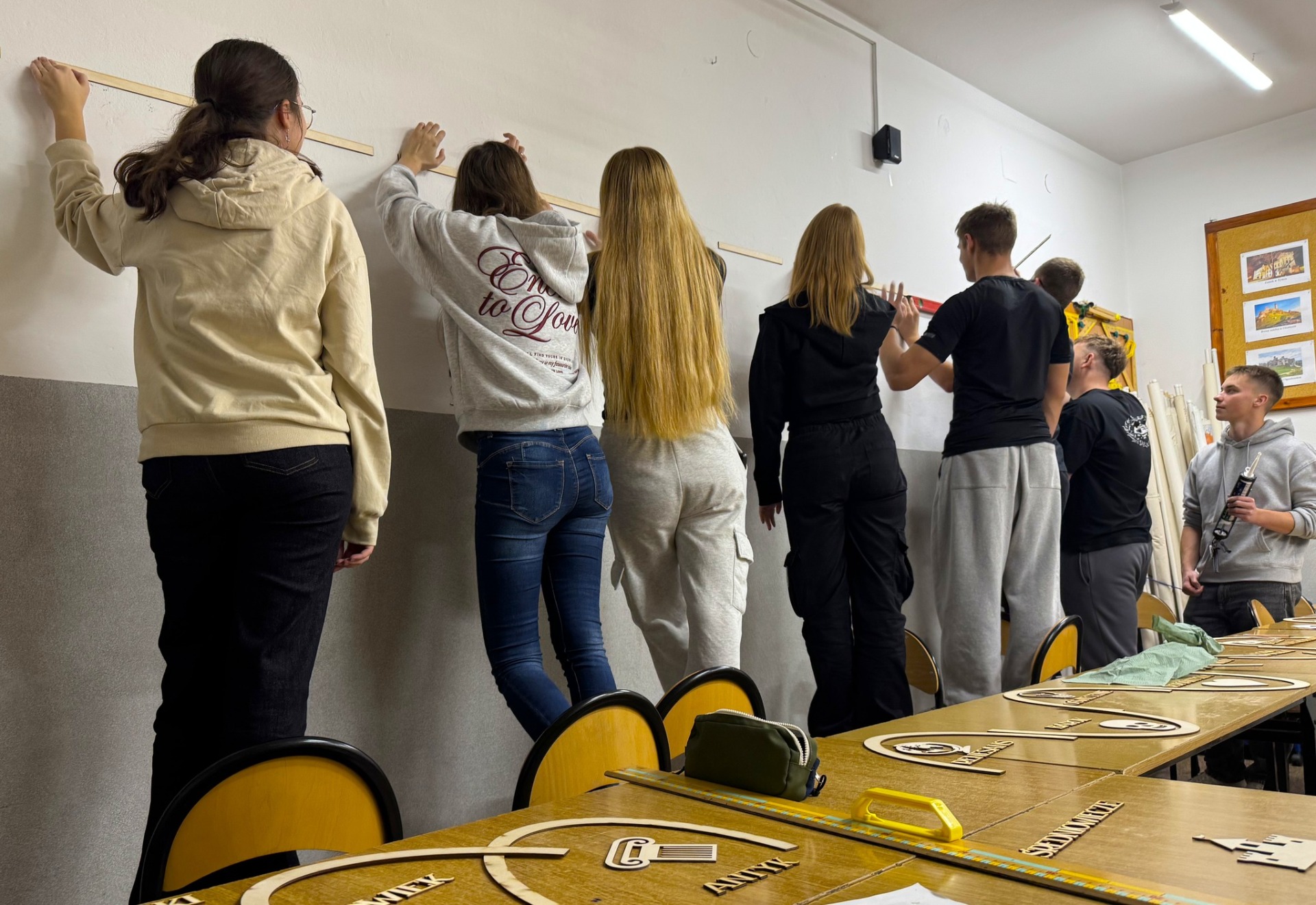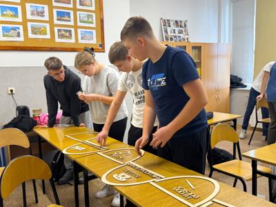 Realizacja: Uczniowie klasy pierwszej próbują swoich sił w poprawnym ułożeniu sinusoidy epok, następnie czwartoklasiści montują na ścianie kolejne elementy pomocy naukowej.
