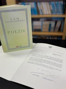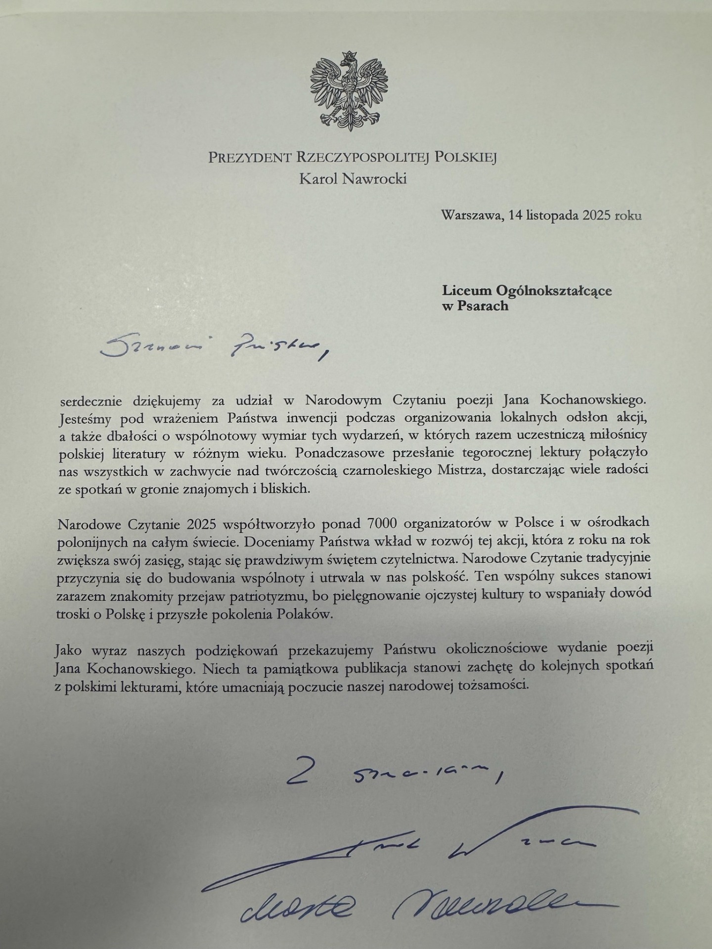 Tradycyjnie już - jak w latach poprzednich - Liceum otrzymało specjalne podziękowanie Pary Prezydenckiej za tegoroczną organizację Narodowego Czytania. Upominkiem dla szkoły jest piękna publikacja "Poezji" Jana Kochanowskiego, wydana przez Kancelarię Prezydenta RP